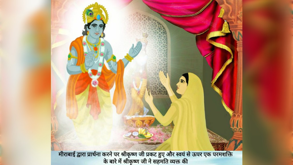 बचपन में किसी दुल्हन को डोली में जाते देख ,माता से इन्होंने पूछा कि ये कहा जा रही है ,माता ने उत्तर दिया अपने पति से विवाह करके अपने ससुराल जा रही है ,तब इन्होंने पूछा कि मेरा पति कौन है ,माता ने यूंही भगवान कृष्ण की ओर इशारा कर दिया , कहते है तभी से मीरा ने भगवान कृष्ण को ही अपना पति मान लिया बचपन में ही कृष्ण भगवान से विवाह कर लिया और आजीवन उनकी पत्नी बनकर रही।