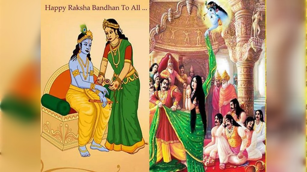 एक बार खेल में भगवान कृष्ण की अंगुली पर चोट लग जाती है तभी द्रोपदी ने अपने वस्त्र का टुकड़ा फाड़ कर गोविंद के हाथ में बांधा तब भगवान कृष्ण ने द्रोपदी को रक्षा का वचन दिया और द्रोपदी के चिर हरण में कृष्ण कृपा से द्रोपदी की रक्षा हुई और पता ही नहीं चला कि नारी बीच सारी है या सारी बीच नारी । तभी से रक्षाबंधन का त्यौहार मनाया जाता है।